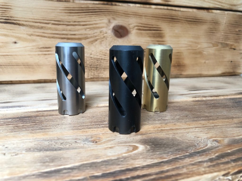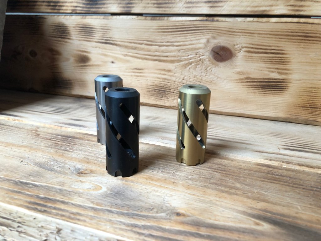 Light weight flash hider, coolsing and disperses exhaust gases, partially compensates for recoil. Material Titanium with PVD surface.