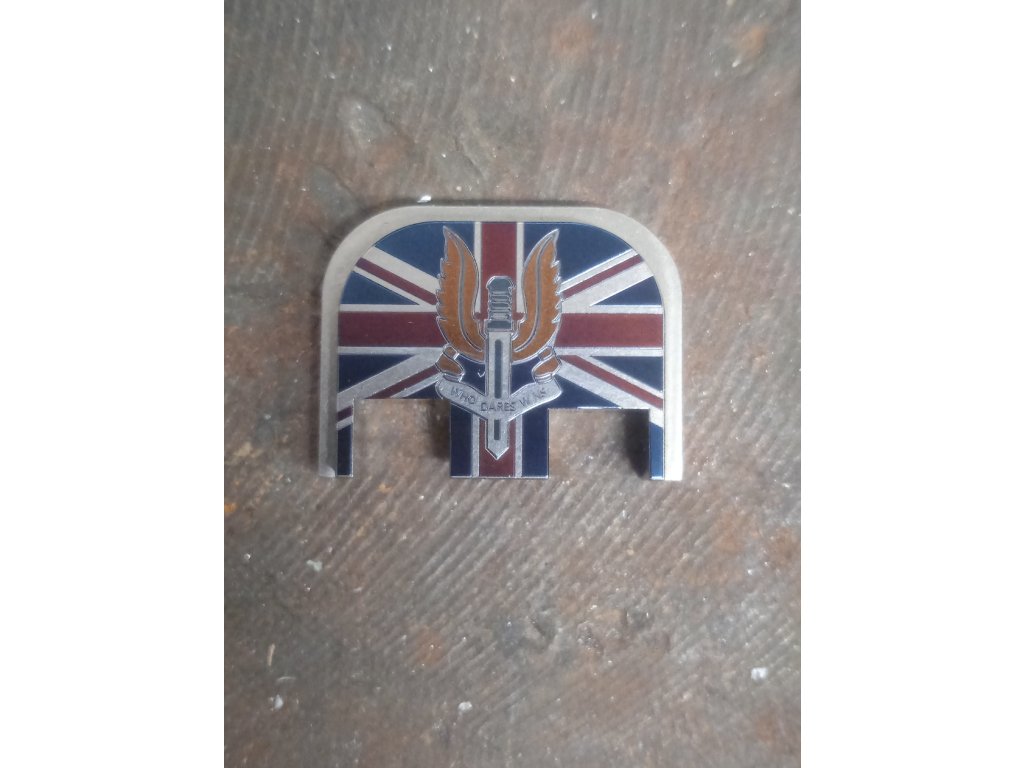 Slide cover plate with motiv Who Dares Wins, anodizing Ti